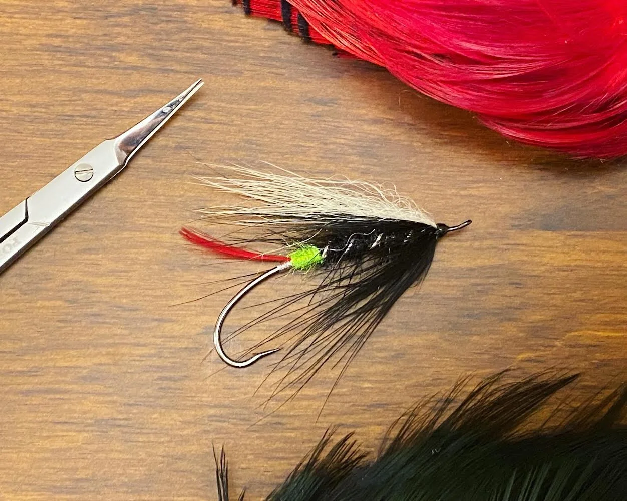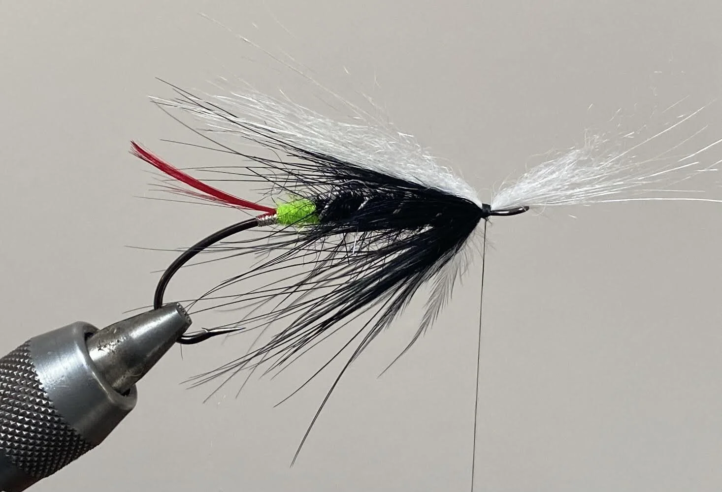 Wrap the hackle at the head tightly and tie in the wing. I’ve used polar bear here but calf, bucktail or white cock hackle feathers will work. To keep the Spey style look ive left the wing on the short side and tied flat.