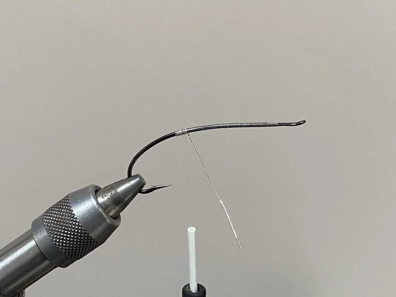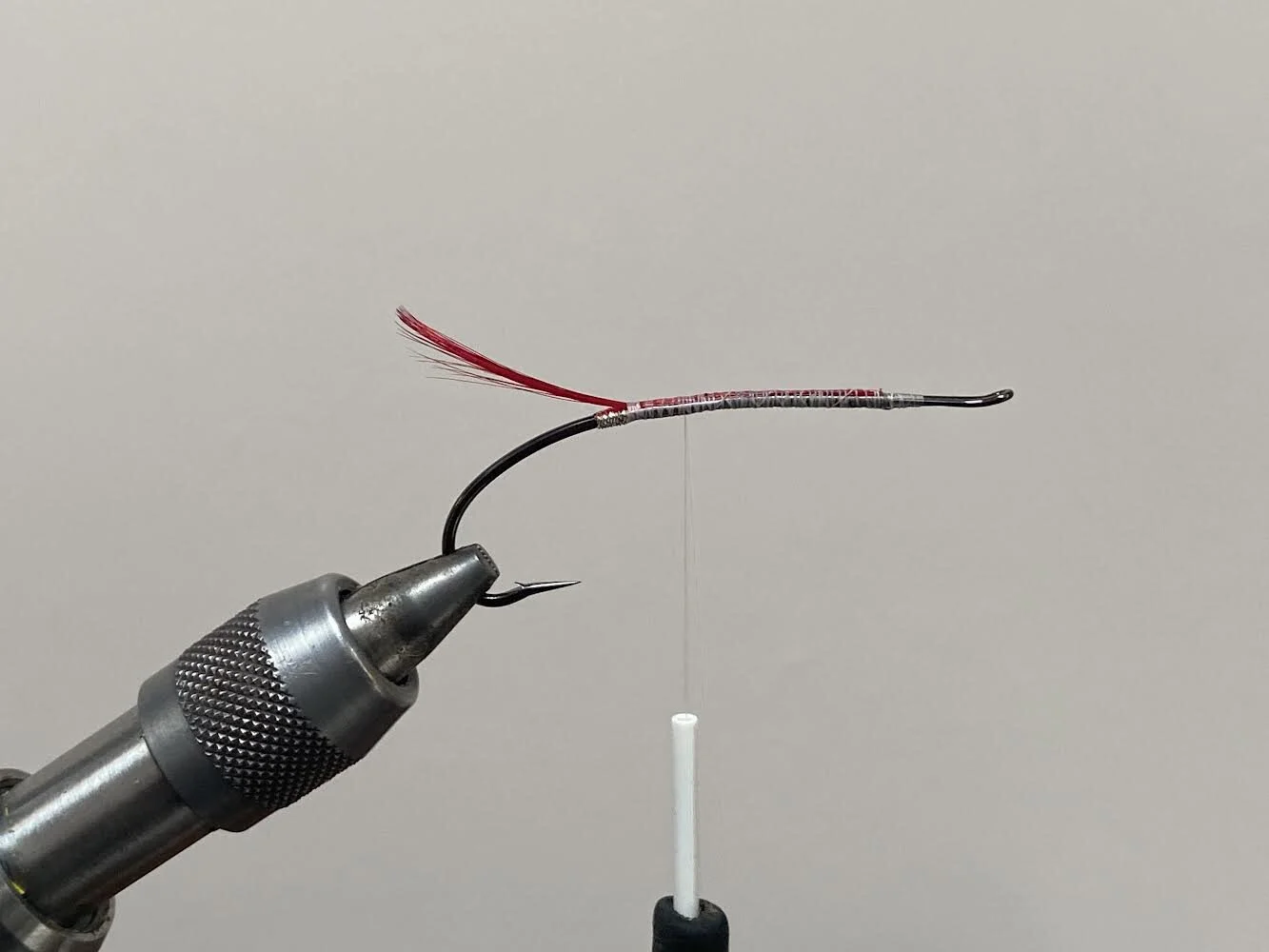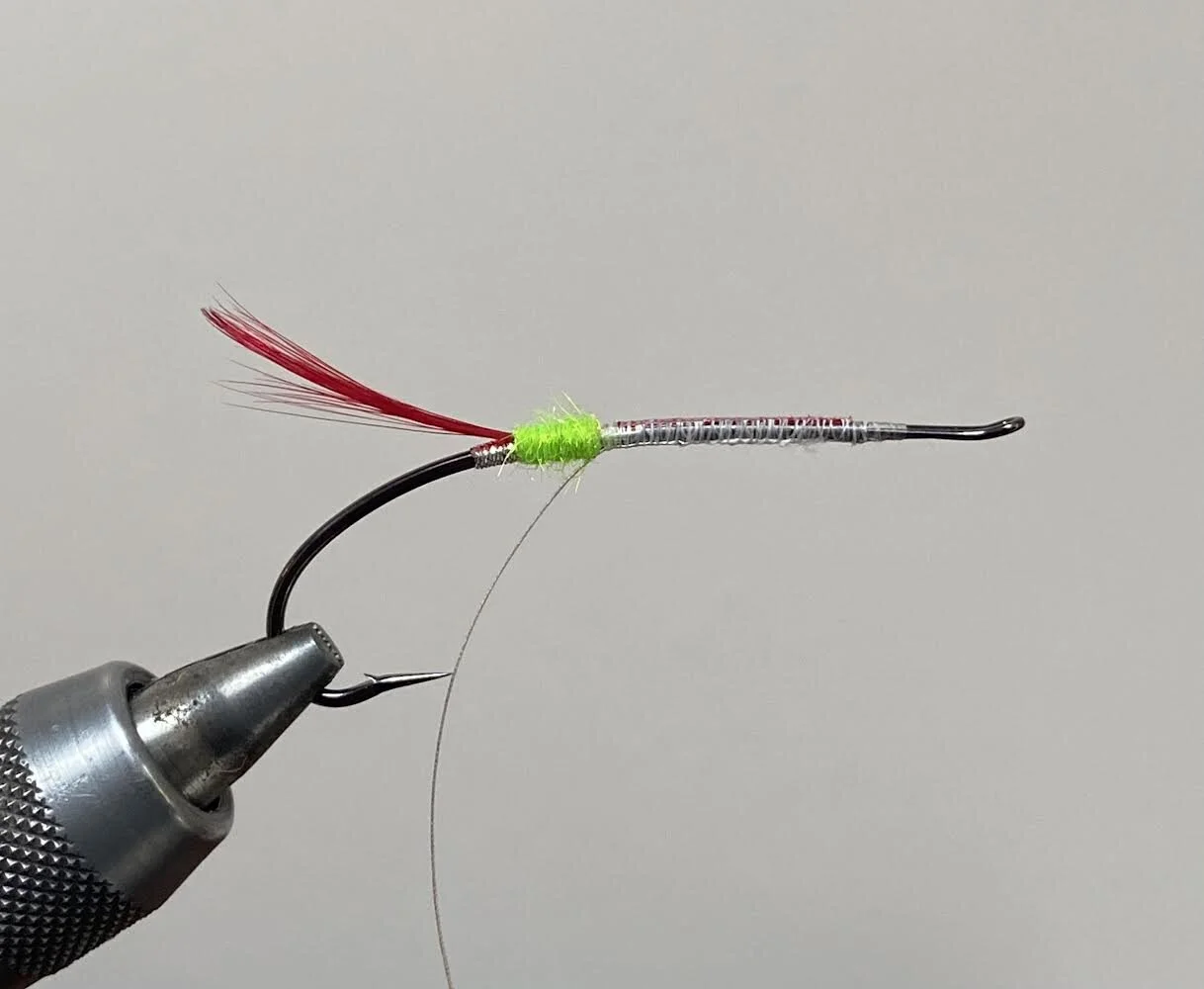Tie in some silver tinsel of choice. I’ve used some wider silver oval tinsel.