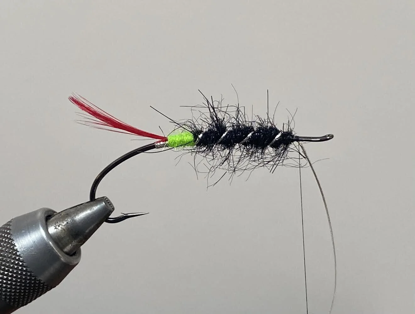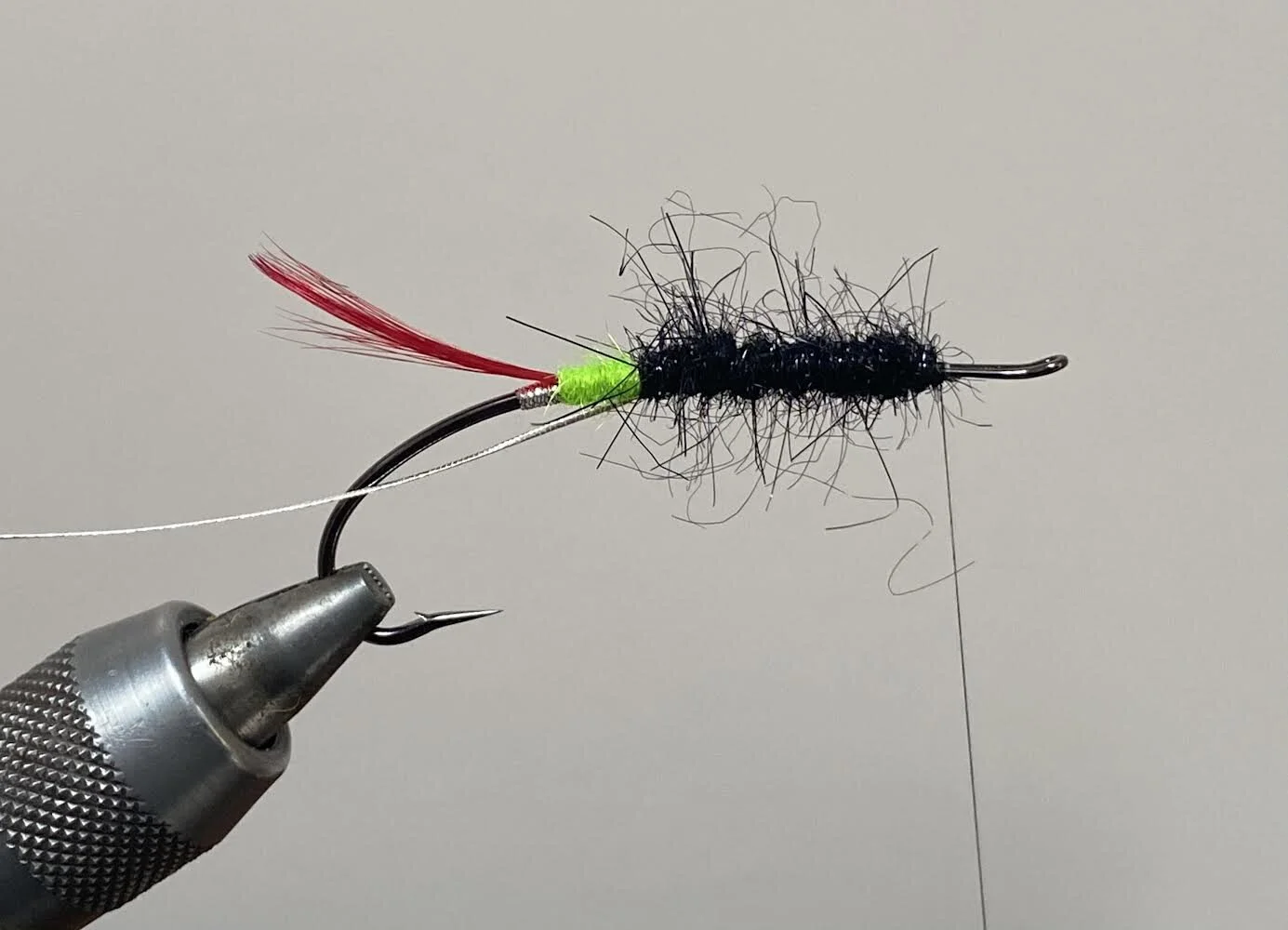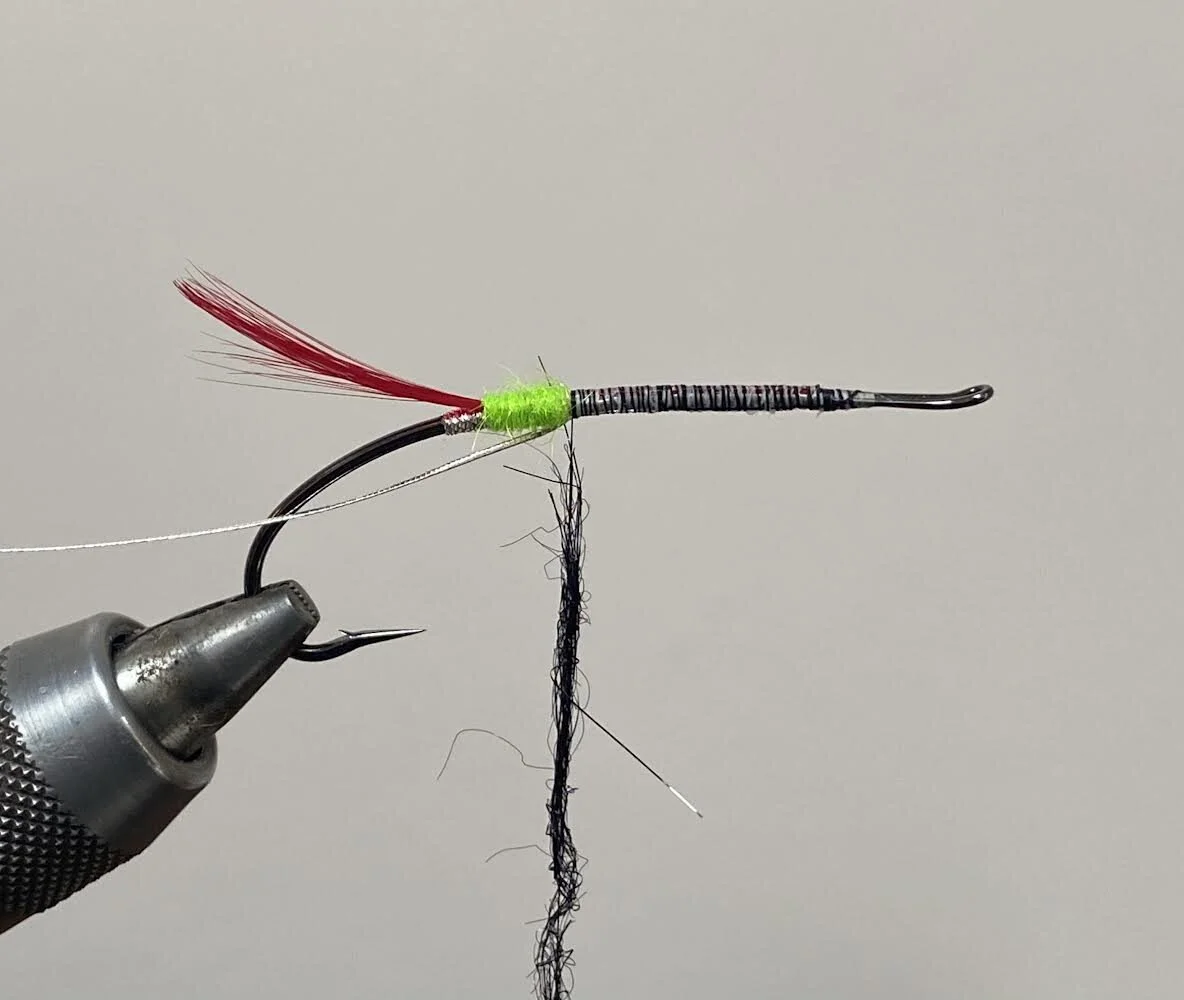 Tie on some black thread and twist some black dubbing onto it into a rope. I’ve used a man made dubbing but seals fur or similar would be ideal also.