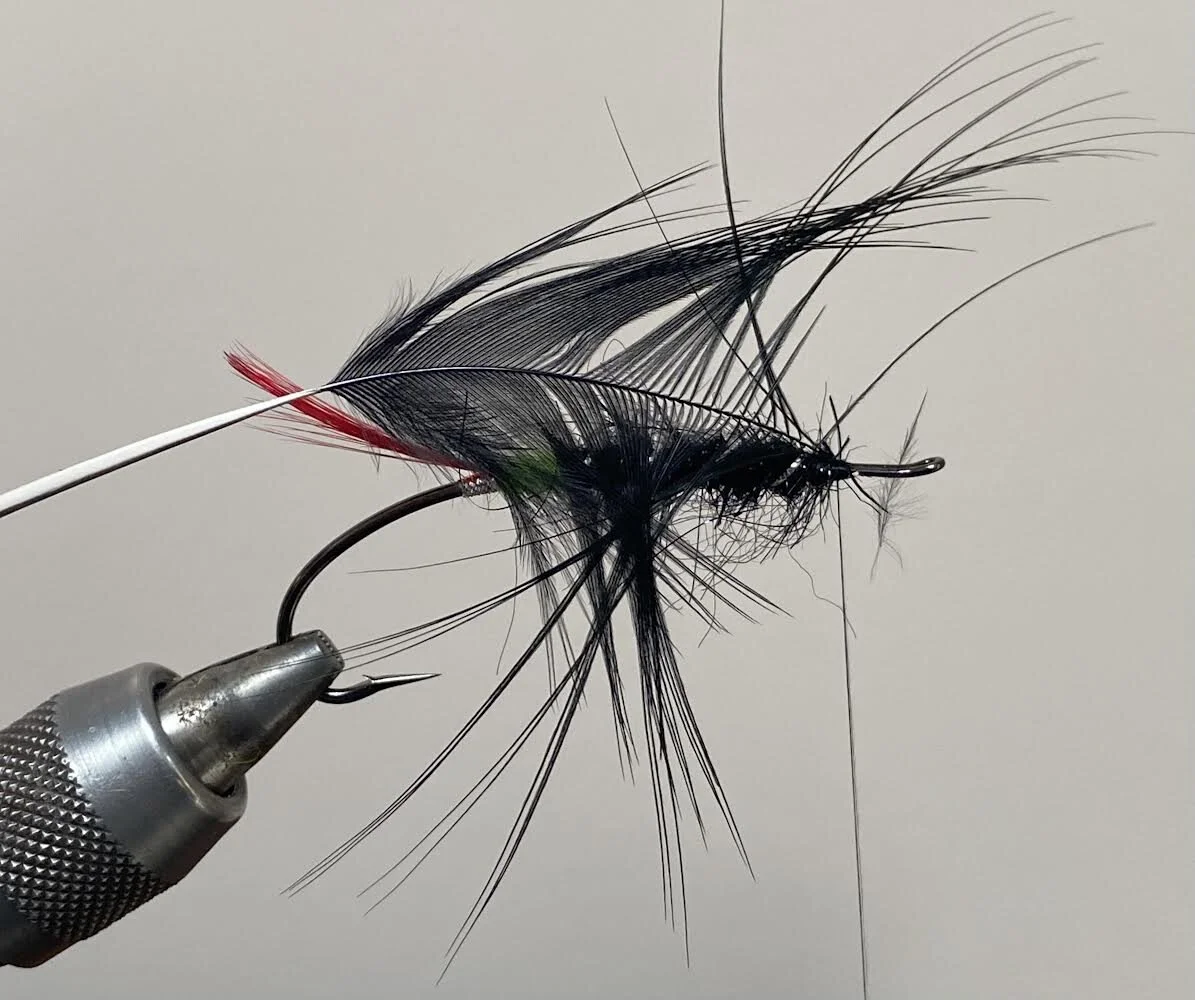 Tie in a black dyed pheasant rump feather as a hackle.